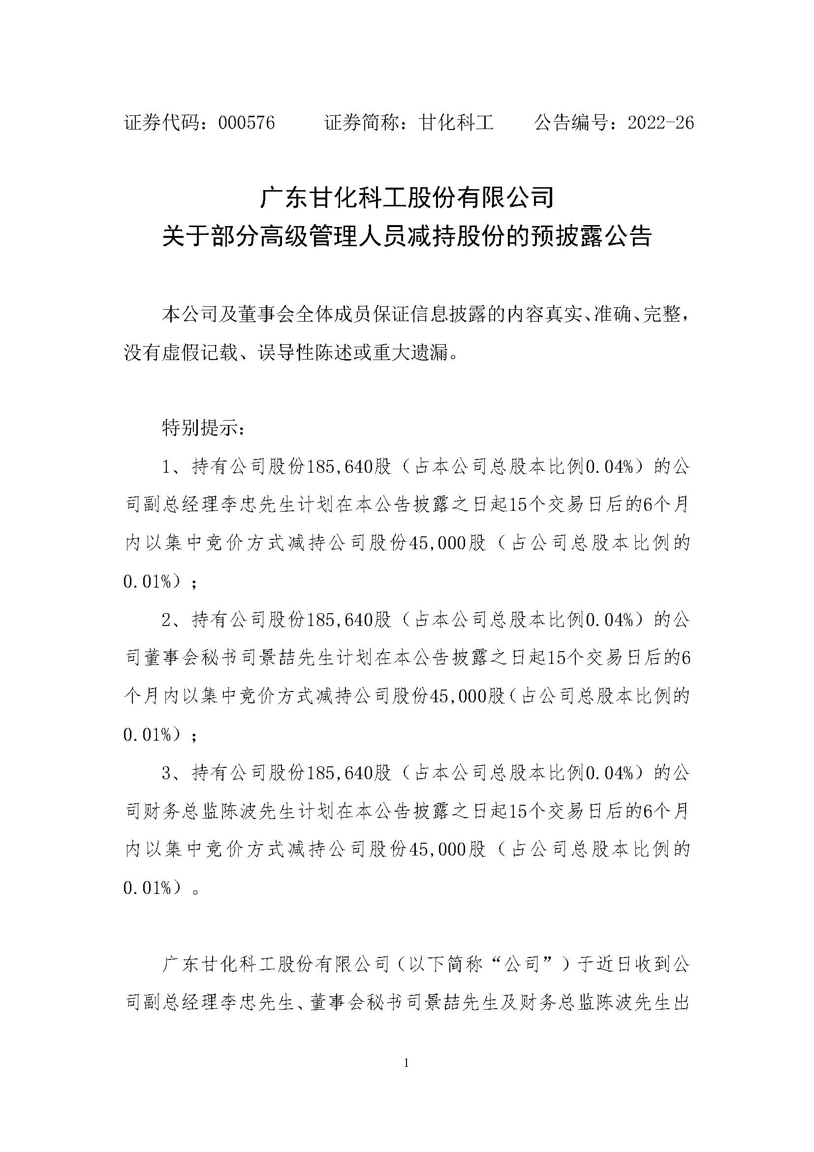 關(guān)于部分高級管理人員減持股份的預(yù)披露公告